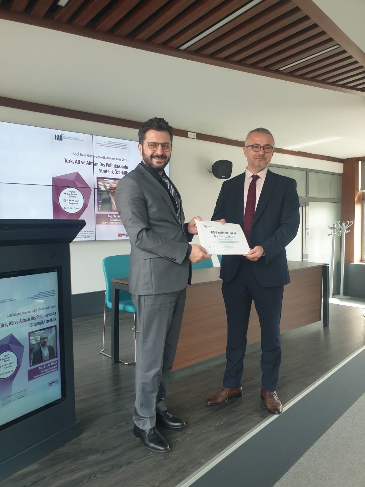 2025-2026 Eğitim-Öğretim Güz Yarıyılı Açılış Dersi, uluslararası ilişkilerin en güncel ve kritik konularından biri olan “Türk, AB ve Alman Dış Politikasında Stratejik Özerklik” başlığıyla YDYO Konferans Salonu’nda büyük bir ilgiyle gerçekleşti. Siyaset Bilimi ve Uluslararası İlişkiler Bölüm Başkanımız Prof. Dr. Enes Bayraklı, akademisyenlerimiz ve öğrencilerimizin geniş katılımıyla gerçekleşen etkinlik, yeni akademik döneme güçlü bir başlangıç sağladı. Akademisyenlerimizin ve öğrencilerimizin yoğun ilgi gösterdiği programda Doç. Dr. Ali Aslan, Türk, Avrupa Birliği (AB) ve Alman dış politikalarının değişen küresel jeopolitik dengeler karşısında kendi ulusal çıkarlarını koruma ve karar alma yeteneklerini güçlendirme çabası olan “Stratejik Özerklik” kavramının önemini vurguladı.