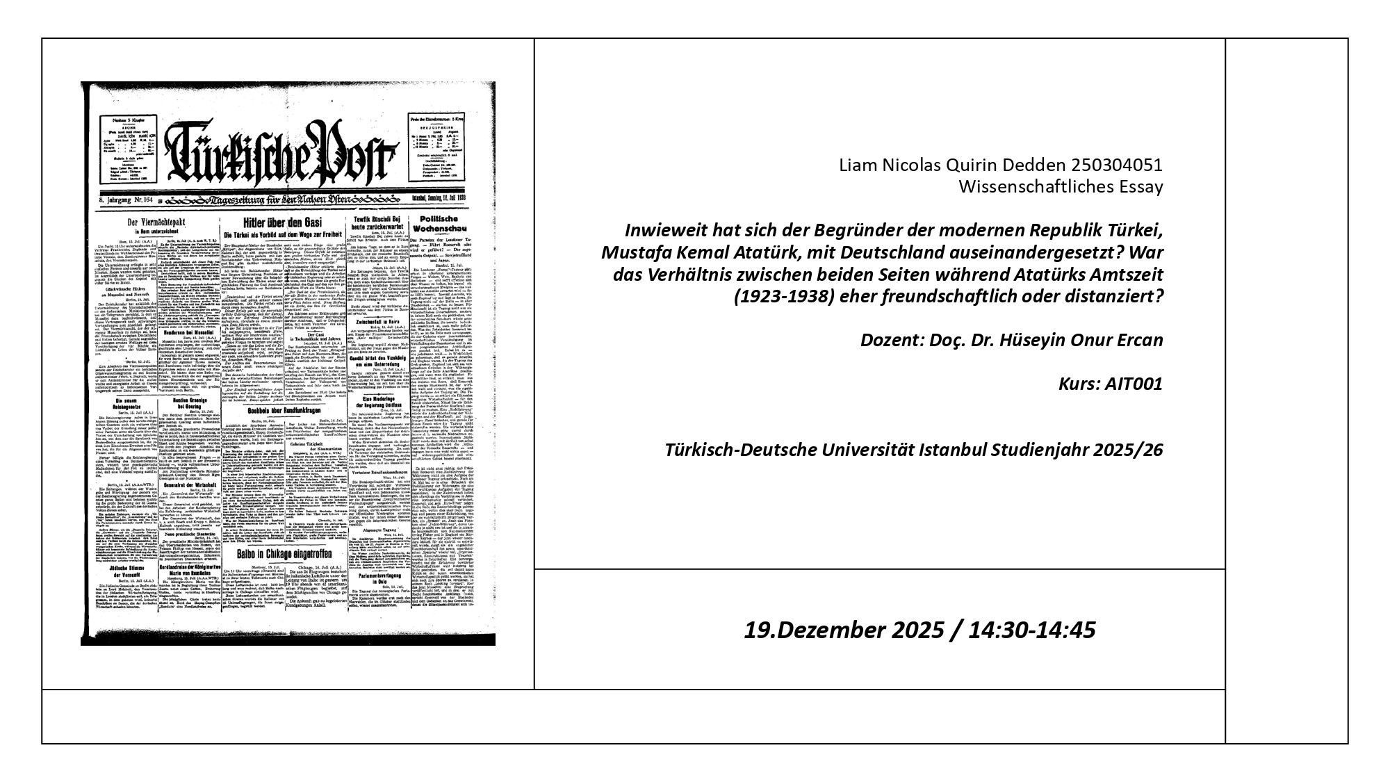 Unter der Leitung von Assoc. Prof. Dr. Hüseyin Onur Ercan, einem Mitglied unserer Fakultät, wird Liam Nicolas Quirin Dedden, Student unserer Fakultät, einen Vortrag zum Thema "Inwieweit hat sich der Begründer der modernen Republik Türkei, Mustafa Kemal Atatürk, mit Deutschland auseinandergesetzt? War das Verhältnis zwischen beiden Seiten während Atatürks Amtszeit (1923-1938) eher freundschaftlich oder distanziert?" halten. Sie können Ihre Teilnahme über den unten stehenden Link anmelden. Die Umfrage ist bis zum 18. Dezember um 13:00 Uhr aktiv.